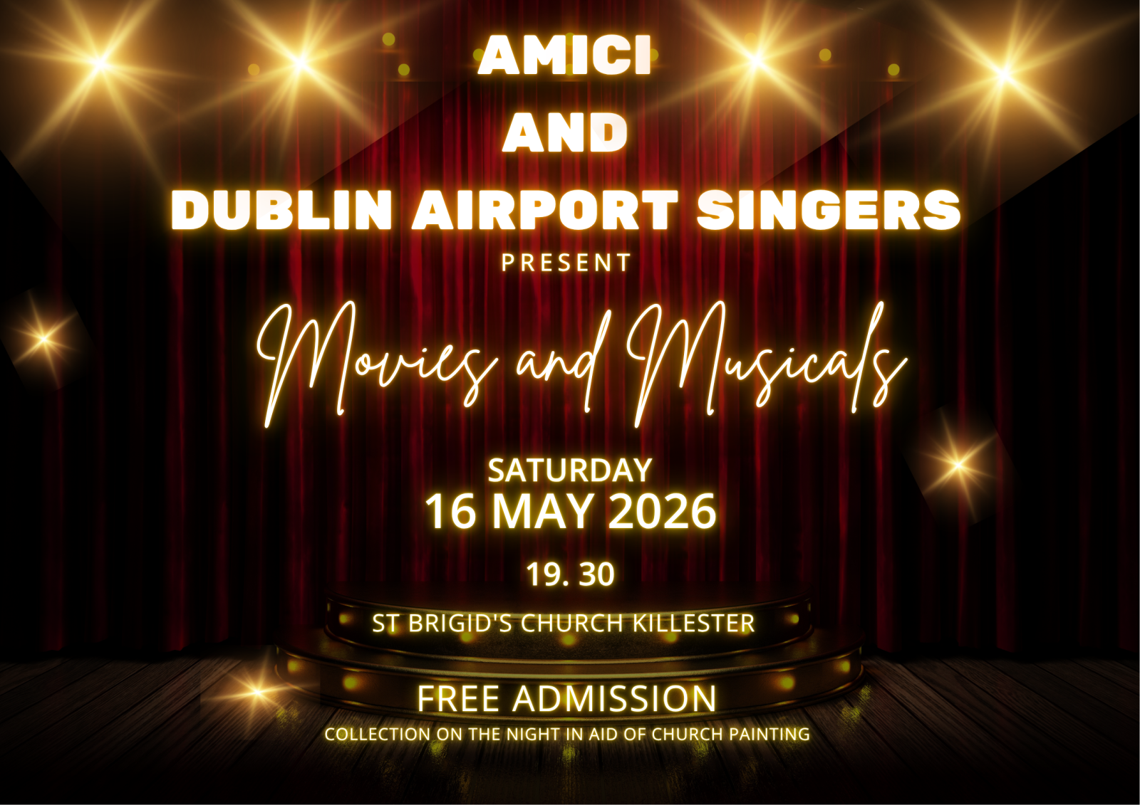 We are joining our friends in Amici again for another wonderful night of music from Movies and Musicals in St. Brigid’s Church on the Howth Road in Killester on Saturday 16th May at 7.30pm. Admission is free, with a collection on the night in aid of the church.